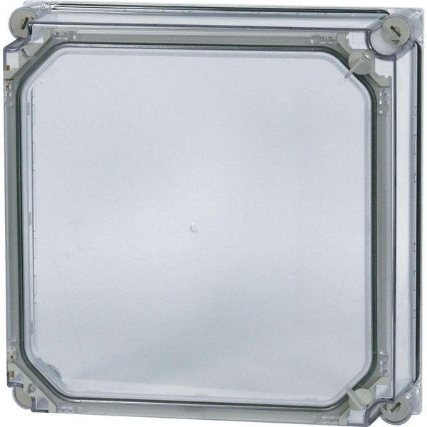 Abdeckung transparenter rauchgrau mit Tür, Schutzart IP65, patentierter Deckelverschluss mit integriertem Überdruckausgleich, plombierbare Deckelverschlüsse, durchgehende Schaumstoffdichtung, Einbautiefe bei Montageplatte=150mm, verwendbar für CI Unterteile E, X und V, Typ des Türverriegelungsmechanismus: manueller Betrieb