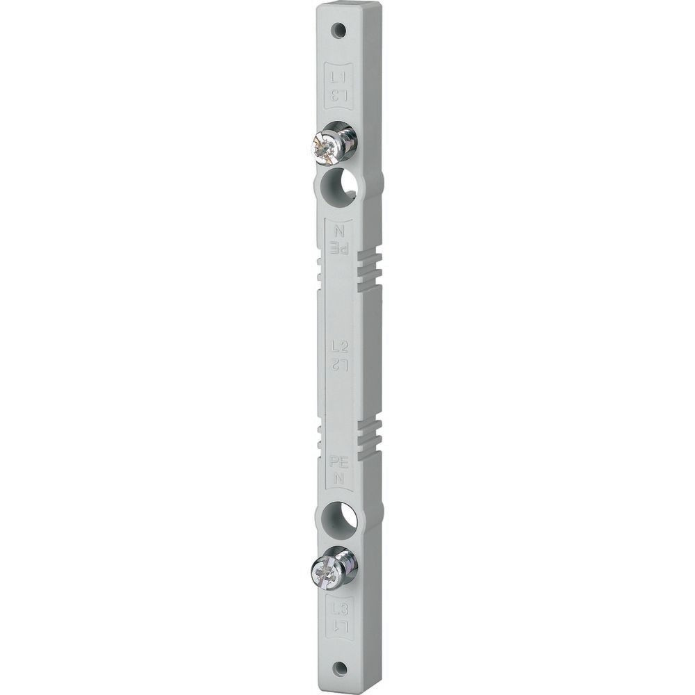 Compact-Sammelschienenträger, 60-mm-System, Bemessungsbetriebsstrom le = 360 A, Pole = 3, verwendbar für 12 x 5/10, mit abnehmbarem Kontaktelement zur Anpassung der Sammelschienengröße, mit innen liegenden Anschraublöchern und integrierter Endabdeckung, temperaturbeständig bis 120 °C, Kriechstromfestigkeit CTI 200, selbstauslöschend UL 94, RAL 7035, Thermoplast, silikonfrei, chlorfrei, halogenfrei, Abstand zwischen Sammelschienenträgern entsprechend Kurzschlussfestigkeitsdiagram