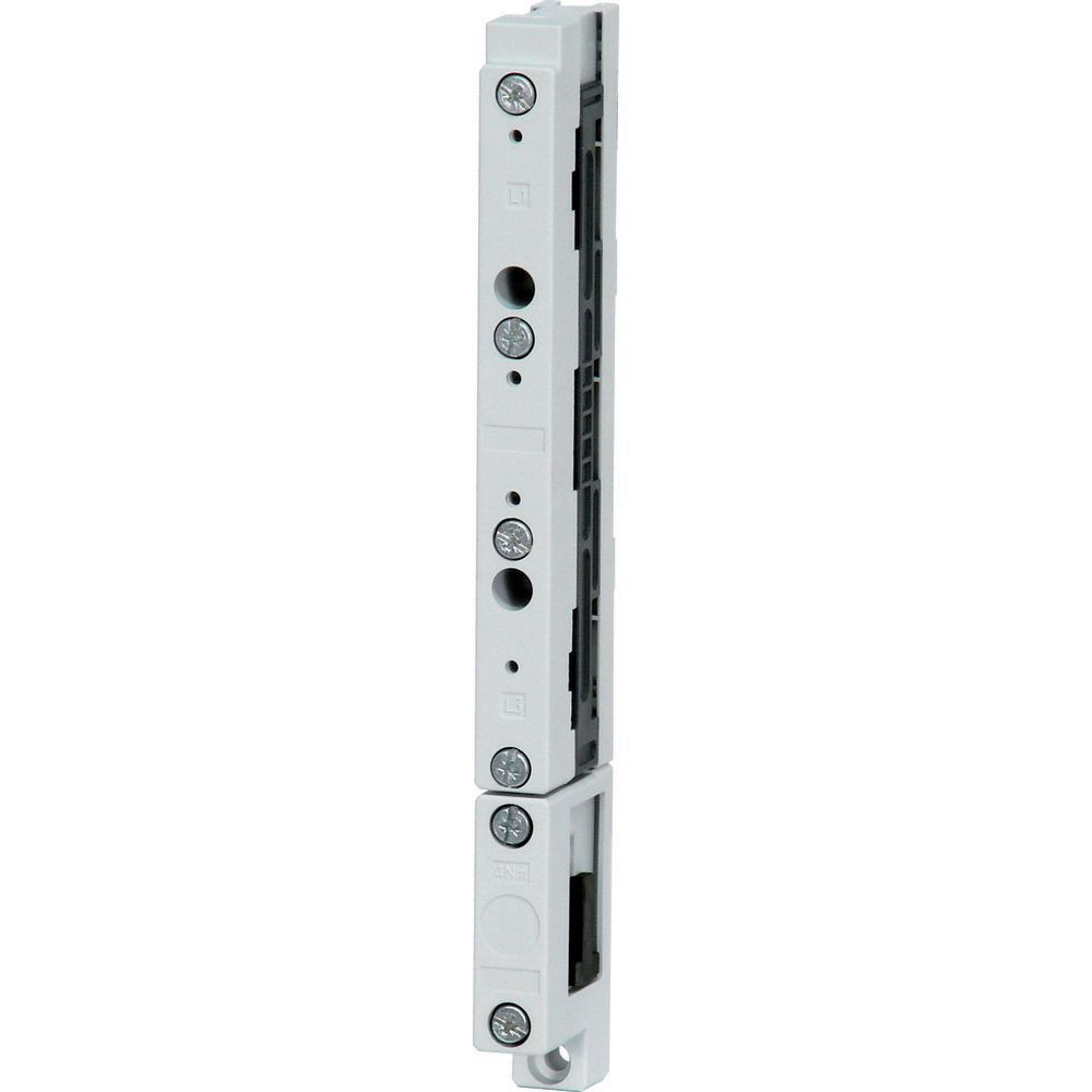 IEC-Sammelschienenträger, 60-mm-System, Bemessungsbetriebsstrom le=630, Pole = 4, verwendbar für 12 x 5/10, 15x5/10, 20x5/10, 25x5/10, 30x5/10, mit Rastschieber zum Anpassen an jeweilige Schienengröße, mit innen liegenden Anschraublöchern, temperaturbeständig bis 120 °C, Kriechstromfestigkeit CTI 200, selbstauslöschend UL 94, RAL 7035, Thermoplast, silikonfrei, chlorfrei, halogenfrei, Abstand zwischen Sammelschienenträgern entsprechend Kurzschlussfestigkeitsdiagram