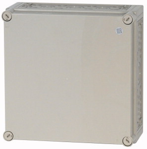 Einzel-Leergehäuse, Material Polycarbonat, schlagfest, Schutzart IP65, patentierter Deckelverschluss mit integriertem Überdruckausgleich, mit metrischen Vorprägungen in allen Seitenwänden, Leitungseinführung oben und unten jeweils=1xM50/32 und 2xM40/25 und 8xM25/16 und 2xM20, seitlich jeweils=1xM63/40 und 6xM25/16 und 10xM20 und 2xM16, Befestigungslaschen für Wandbefestigung, plombierbare Deckelverschlüsse, Seitenwände ausschlagbar, als Verteilergehäuse umbaubar durch ausschlagen der Seitenwände, RAL 7032, kieselgrau (Unterkasten), RAL 7032, kieselgrau (Deckel), Einbautiefe bei Montageplatte=150mm, Ausführung Deckel: undurchsichtig, Ausführung Unterteil: vorgeprägt, Deckel optional nachrüstbar mit Zylinderschloss DVZ...-CI