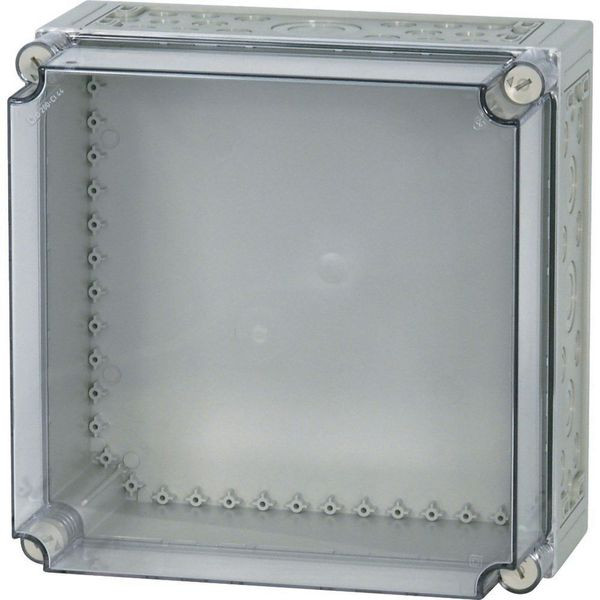 Einzel-Basisgehäuse, Material Polycarbonat, schlagfest, Schutzart IP65, patentierter Deckelverschluss mit integriertem Überdruckausgleich, mit metrischen Vorprägungen für Kabelführungen an allen Seiten, Leistungseinführungen oben und unten, jeweils = 1x M50/32, 2x M40/25, 8x M25/16 und 2x M20, jede Seite = 1x M63/40, 6x M25/16, 10x M20 und 2xM16, Befestigungsbänder zur Wandbefestigung, plombierbare Deckelverschlüsse, Seitenwände ausschlagbar, als Verteilergehäuse umbaubar durch Ausschlagen der Seitenwände., RAL 7035, Grau (Sockel), transparent rauchgrau, (Abdeckung), Einbautiefe bei Montageplatte=200mm