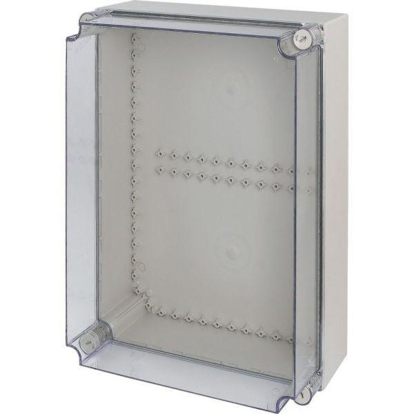 Einzel-Leergehäuse, Material: Polycarbonat, schlagfest, Schutzart IP65, optional abschließbar mit DVZ...-CI, patentierter Deckelverschluss mit integriertem Überdruckausgleich, glatte Seiten, ohne Vorprägungen, Befestigungsbänder zur Wandbefestigung, plombierbare Deckelverschlüsse, RAL 7035, Grau (Sockel), transparent rauchgrau, (Abdeckung), Einbautiefe bei Montageplatte=200mm, Abdeckungstyp: transparent rauchgrau, Ausführung Unterteil: glatt
