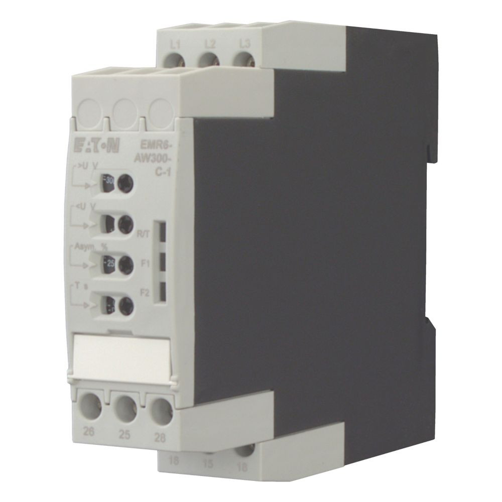 Phasenwächter, Sortiment: Mess- und Überwachungsrelais EMR, multifunktional, Stromversorgung aus dem Messkreis, Einschaltverzögerung/Ausschaltverzögerung: keine = 0 oder einstellbar zwischen 0,1 - 30 s, Unsymmetrie-Schwellenwerte einstellbar 2 - 25 % vom Mittelwert der Phasenspannungen, Dreiphasennetze, Überwachungsspannung je Phase: UN= 160 - 300 V AC, 50/60 Hz V AC, Überwachung von: Phasenfolge (deaktivierbar), Phasenausfall, Überspannung, Unterspannung, Ungleichgewicht, Versorgungsspannung: 160 - 300 V AC, 50/60 Hz, Einbaulage: beliebig, Befestigung: Schnappbefestigung, Hutschiene IEC/EN 60715, Breite: 22,5 mm, Normen und Bestimmungen: IEC, UL, CSA, CCC, GL