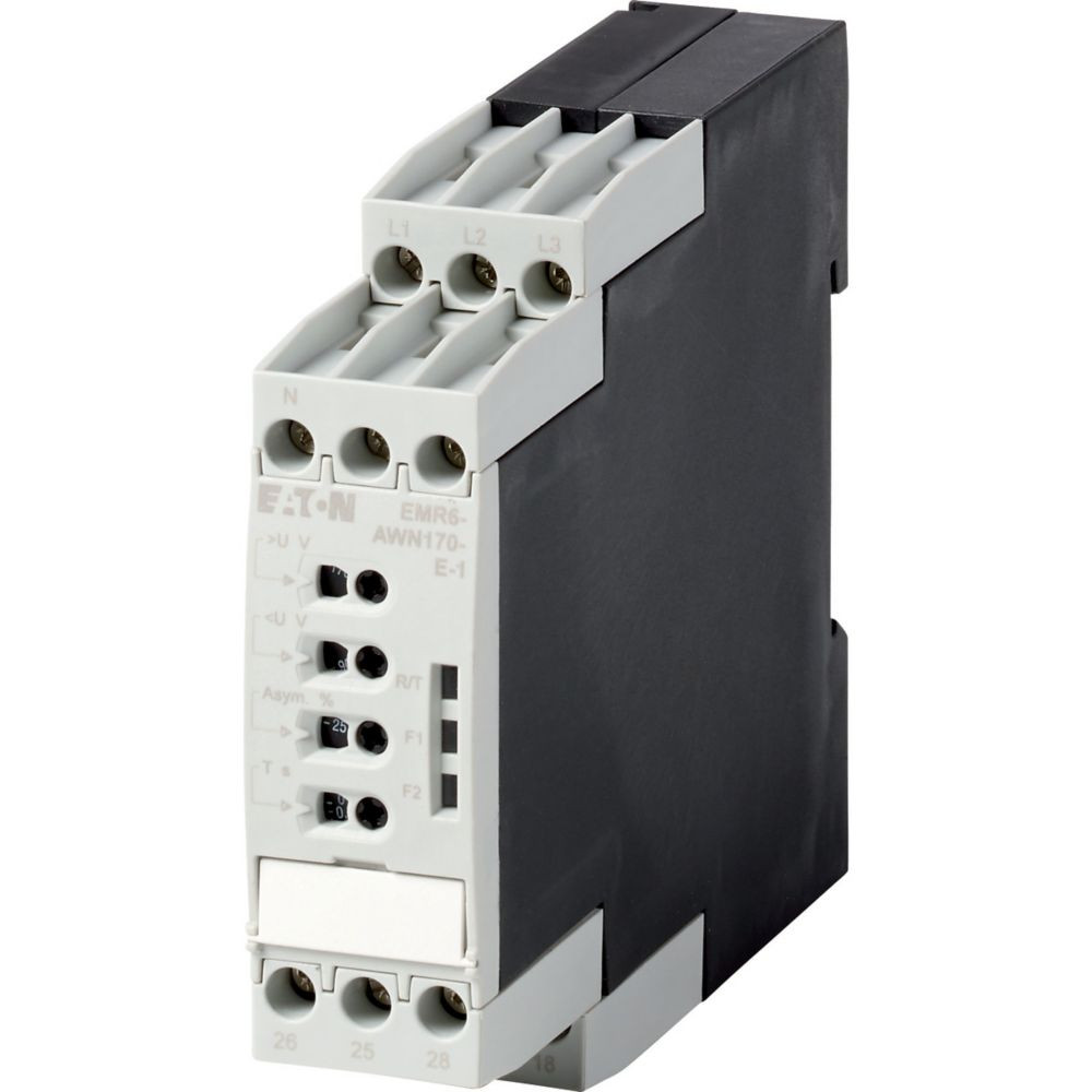 Phasenwächter, Sortiment: Mess- und Überwachungsrelais EMR, multifunktional, Stromversorgung aus dem Messkreis, Einschaltverz./Ausschaltverz.: keine = 0 oder einstellbar zwischen 0,1 - 30 s, Unsymmetrie-Schwellenwerte einstellbar 2 - 25 % vom Mittelwert der Phasenspannungen, Automatische Phasenfolgekorrektur (kann deaktiviert werden), Auch für einphasige Netze geeignet., Überwachungsspannung je Phase: UN= 90 - 170 V AC, 50/60 Hz V AC, Überwachung von: Phasenfolge (deaktivierbar), Phasenausfall, Überspannung, Unterspannung, Ungleichgewicht, Neutralleiterbruch, Versorgungsspannung: 90 - 170 V AC, 50/60 Hz, Einbaulage: beliebig