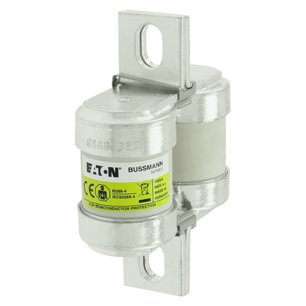 Sicherung, Sicherungseinsatz, superflink, 325 A, AC 660 V, DC 350 V, BS88, 78 x 107 mm, aR, BS, ultra rapid, gekröpfte verschraubte Anschlussfahnen (Doppelzylinder), Absicherung von Halbleitergeräten, BS88-4, Ausschaltvermögen 100 kA