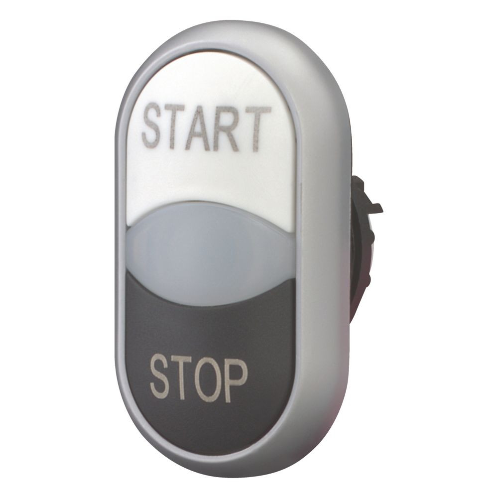 | Kurzbeschreibung | Doppeldrucktaste, RMQ-Titan, Tasten und Leuchtmelder vorstehend, tastend, Vorsatzlinse weiß, weiß, schwarz, beschriftet, Frontring Titan, START/STOP |
