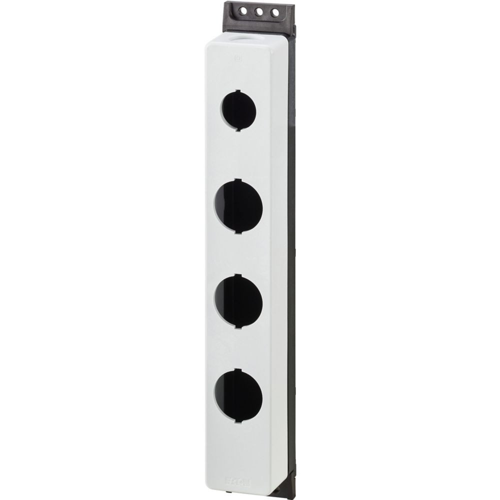 Aufbaugehäuse, Gehäuse: Kunststoff, mit Edelstahlschrauben, Einbaustellen: 4, Leitungseinführung: rückseitig: 1 x M20, seitlich: 2 x M20 (je Seite 1 x), Farbe RAL-Wert: RAL 7035, Farbe: Gehäuseunterteil anthrazit, Anbindung an SmartWire-DT: nein, Verwendbar für: 3 x 30,5, 1 x 22,5, verwendbar für: (Leucht)-Drucktasten, (Leucht-)Wahltasten, Schlüsseltasten, Leuchtmelder, NOT-HALT-/NOT-AUS-Tasten mit gelbem Schild, Flat Rear Kontakte M22-FK…, Flat Rear LED-Elemente M22-FLED-…