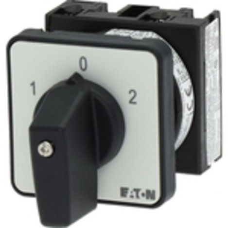 Umschalter, Sortiment: Steuerschalter, Typkenner: T0, mit schwarzem Knebel und Frontschild, Kontakte: 2, Schutzart: Front IP65, Bauform: Einbau, Schaltwinkel: 60 °, Schaltverhalten: rastend, mit 0-Stellung, Frontschild: 1-0-2, Bemessungsbetriebsleistung AC-23A, 50 - 60 Hz 400 V: P = 5,5 kW, Bemessungsdauerstrom: Iu = 20 A, 1 Baueinheit(en), Normen und Bestimmungen: IEC/EN 60947, VDE 0660, IEC/EN 60204, CSA, UL, Lasttrennschalter nach IEC/EN 60947-3