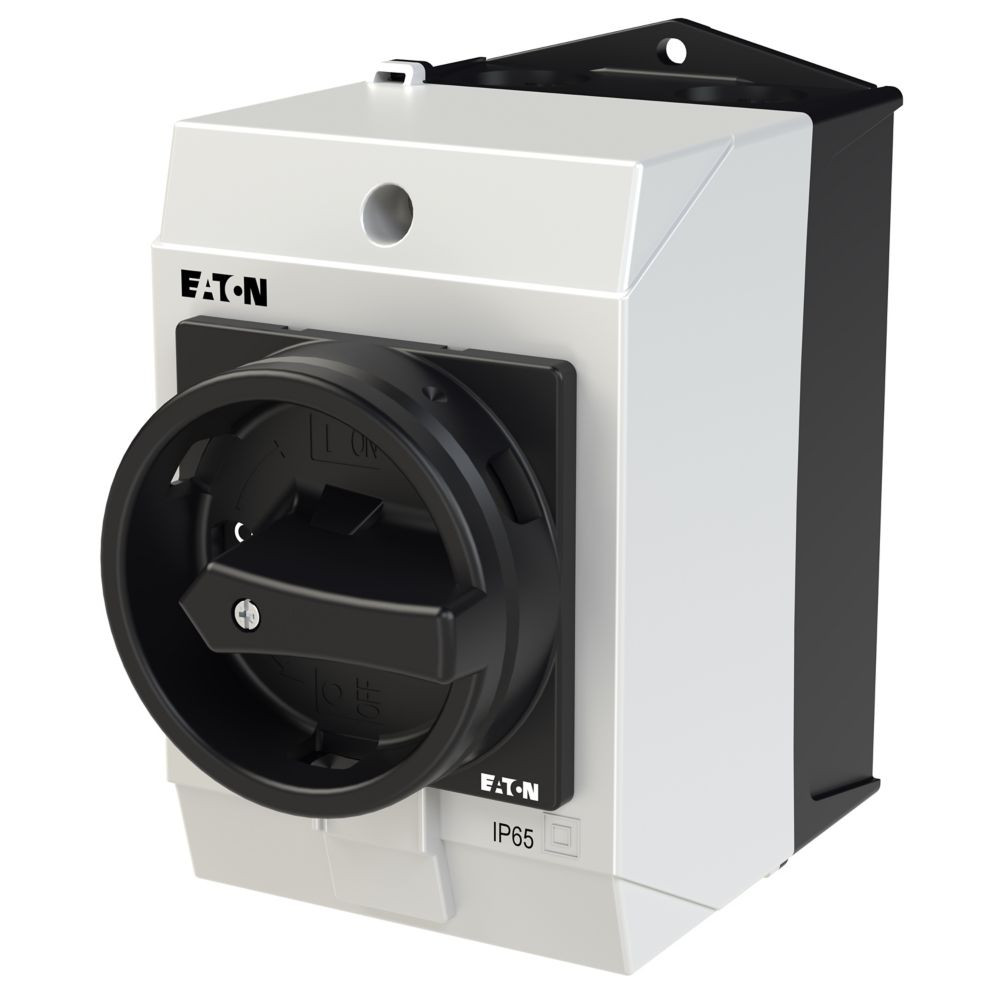 Hauptschalter, Sortiment: Hauptschalter, Wartungsschalter, Reparaturschalter, Typkenner: T0, Stopp-Funktion: STOPP-Funktion, mit schwarzem Drehgriff und Sperrkranz, 3-polig, Verriegelungsvorrichtung: In der Position 0 (Aus) verriegelbar, Schutzart: IP65, Bauform: Oberflächenmontage, Schaltwinkel: 90 °, Bemessungsbetriebsleistung AC-23A, 50 - 60 Hz 400 V: P = 5,5 kW, Bemessungsdauerstrom: Iu = 20 A, 3 Baueinheit(en), Normen und Bestimmungen: IEC/EN 60947, VDE 0660, IEC/EN 60204, Lasttrennschalter nach IEC/EN 60947-3