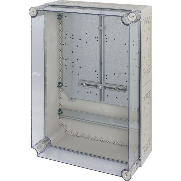 Zählergehäuse mit Zählerkreuz, Material: Polycarbonat, schlagfest, patentierter Deckelverschluss mit integriertem Überdruckausgleich, Tiefe=225mm, metrische Vorprägungen für Kabelführungen an allen Seiten, Befestigungsbänder zur Wandbefestigung, plombierbare Befestigungen am oberen Rand der Abdeckung, Zählerkreuz nach DIN 43853 einschließlich Zählerbefestigungsschrauben und Muttern, Schutzart IP65, Abdeckungstyp: transparent rauchgrau