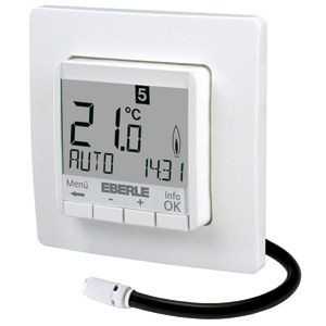 Unterputz-Uhrenthermostat eignet sich für die Regelung von Elektrodirektheizung oder Warmwasserfussbodenheizungen. Sehr grosse Anzeige, die Hinterleuchtung in weiss ist aus, kurzzeitig ein nach Tastendruck. Einzeilige Textanzeige zur selbsterklärenden Bedienung. Automatische Sommer/Winterzeitumstellung. Minimale und Maximale Bodentemperatur einstellbar. Voreingestellte u. anpassbare Lifestyle Zeitprogramme. Unbefugtensicherung. Optimum-Start (Temperatur wird zur eingestellten Zeit erreicht). Max. 9 Schaltzeiten pro Tag. Kurzzeit-Timer (Party) für Stundenweise Änderung der Temperatur. Frostschutzfunktion. Einstellbereich der Temperatur begrenzbar. Urlaubsfunktion mit Datumsangabe (Urlaub von....bis). Reglerverfahren PWM oder 2-Punkt. Heizen/Kühlen Umschaltung, Anpassung an Ventile stromlos offen. Energieverbrauchsanzeige (Einschalten x Kosten). Mit 4m Fernfühler (verlängerbar bis 100m) im Lieferumfang. Montage in 55er UP-Dose