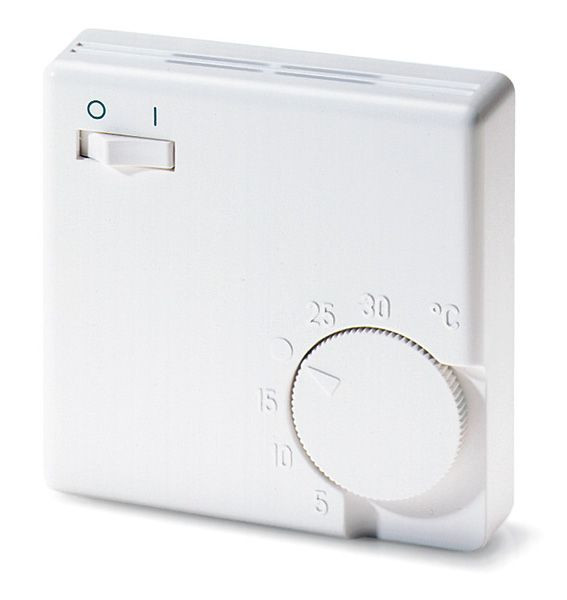 Raumregler für Wandbefestigung. Eignet sich für die Regelung von Zentral-, Warmwasserfußboden-, Elektro-, Nachtspeicherheizungen usw.. Schalter Ein/Aus. Bimetall-Technik mit thermischer Rückführung und hoher Präzision. Aufputzmontage oder direkt auf UP-Dose mit senkrechten Befestigungslöchern oder mit Schnappbefestigung auf DIN-Schiene.