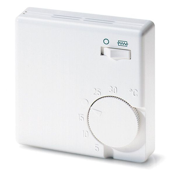 Raumregler für Wandbefestigung. Eignet sich für die Regelung von Nachtspeicher-, Warmluftheizungen usw.. Schalter Zusatzheizung. Bimetall-Technik mit thermischer Rückführung und hoher Präzision. Aufputzmontage oder direkt auf UP-Dose mit senkrechten Befestigungslöchern oder mit Schnappbefestigung auf DIN-Schiene.
