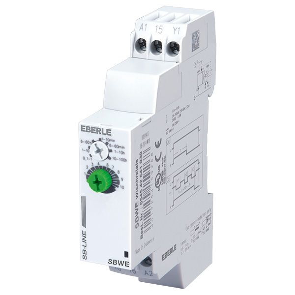 Einschaltwischendes- Relais aus der Typenreihe SB-Line. Die Einstellung der Funktions- und Zeitbereichsauswahl erfolgt frontseitig durch rastbare Drehschalter. Die Anzeigen für den Zeitablauf, Schaltzustand und Betriebsspannung ermöglichen eine ständige Kontrolle über den Funktionszustand. Funktionsbeschreibung: Nach Anlegen der Betriebsspannung zieht das Relais an und fällt nach Ablauf der eingestellten Zeit wieder ab. Um es erneut zu aktivieren muss die Betriebsspannung unterbrochen werden. Zulassungen: UL und CSA