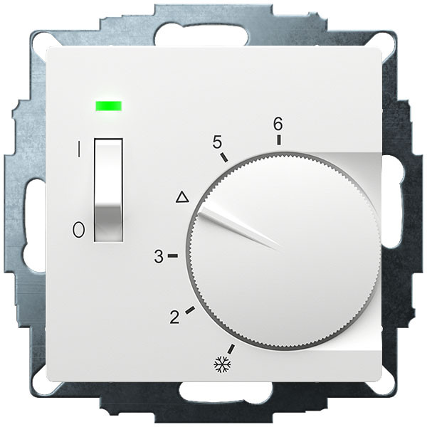 Elektromechanischer Unterputz-Raumtemperaturregler zur Regelung oder Überwachung von Temperaturen in Wohnräumen, Büros und Hotels. Passend in alle gängigen Schalterprogramme. Aktivweiß matt, 55x55 Abdeckung mit Knopf. Geeignet für wassergeführte und elektrische Heizsysteme. Durch die thermische Rückführung wird eine sehr kleine Schaltdifferenz erreicht. Bei Beschalten der Uhren-Klemme wird auf eine um ca. 4K geringere Temperatur geregelt. Mit LED-Statusanzeigen. Einstellbare Bereichseinengung im Einstellknopf als Heizkostenbremse. Eine unverlierbare Schraube mit Gewindeeinsatz zur Befestigung des Gehäusedeckels sowie praktische Steckklemmen erleichtert die Montage. Montage in 55er UP-Dose.