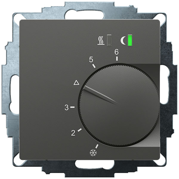 Elektronischer Unterputz-Raumtemperaturregler zur Regelung oder Überwachung von Temperaturen in Wohnräumen, Büros und Hotels. Passend in alle gängigen Schalterprogramme. Anthrazit, 55x55 Abdeckung mit Knopf. Geeignet für wassergeführte Heizsysteme. Durch Einsatz eines Triac-Schalters völlig geräuschlos, im Gegensatz zu Relais oder Bimetall. Automatisch umschaltbar durch einen Change-Over-Eingang, daher einsetzbar zum Heizen und Kühlen. Bei Beschalten der Uhren-Klemme wird auf eine um 3,5K geringere Temperatur geregelt und im Kühlbetrieb um 3,5K erhöht. Mit LED-Statusanzeigen. Einstellbare Bereichseinengung im Einstellknopf als Heizkostenbremse. Eine unverlierbare Schraube mit Gewindeeinsatz zur Befestigung des Gehäusedeckels sowie praktische Steckklemmen erleichtert die Montage. Montage in 55er UP-Dose.