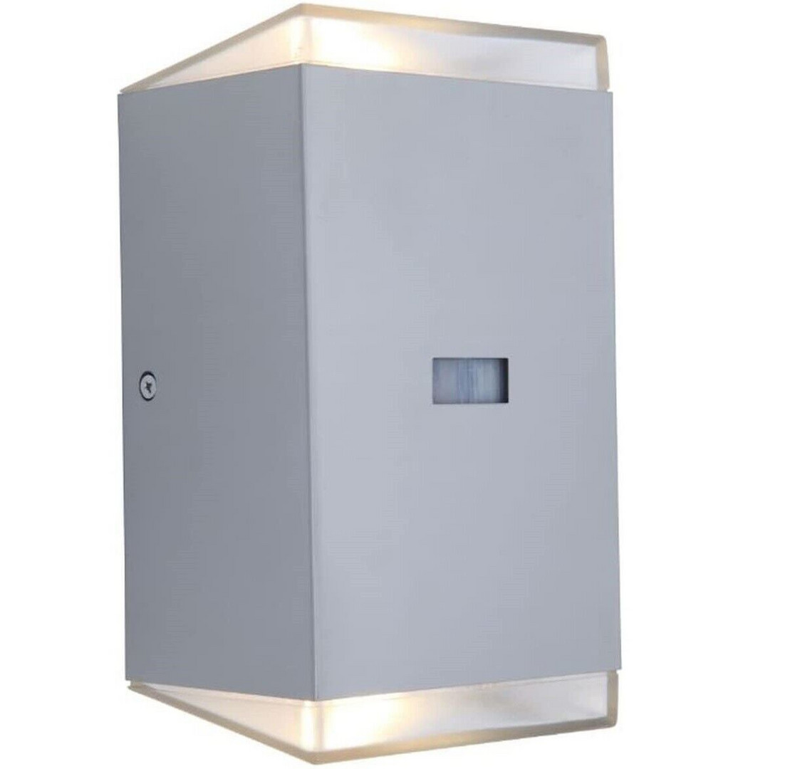 LED Leuchtmittel fest verbaut 16 W (2x8), Farbtemperatur: 3000 warmweiß, Lichtstrom: 800lm, Leuchtrichtung: Up & Downlight, Material: Metall, Spannung: 220V-240V 50Hz, Schutzart: IP44, Bewegungsmelder: PIR-Sensor, Anwendungsbereich: außen, Farbe: silber, Maße HxBxT: 19 x 8,4 x 11 cm