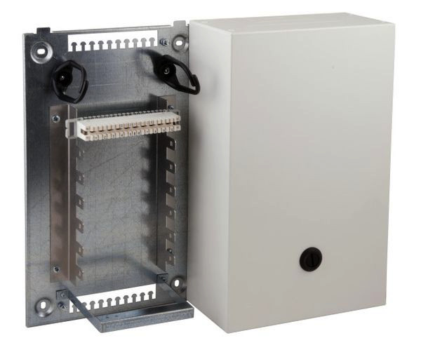 Bestehend aus einem Stahlblechverteiler mit Grundplatte und Haube mit Vorreiber-Verschluss Mit eingebautem VKA-Montagesatz 10DA (für LSA-Anschlussmodule 2/10 zu 10DA)