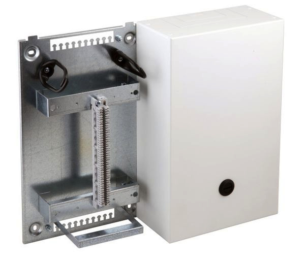 Bestehend aus einem Stahlblechverteiler mit Grundplatte und Haube mit Vorreiber-Verschluss Mit eingebautem VKA-Montagesatz 20DA (für LSA-Anschlussmodule 1/20 zu 20DA)