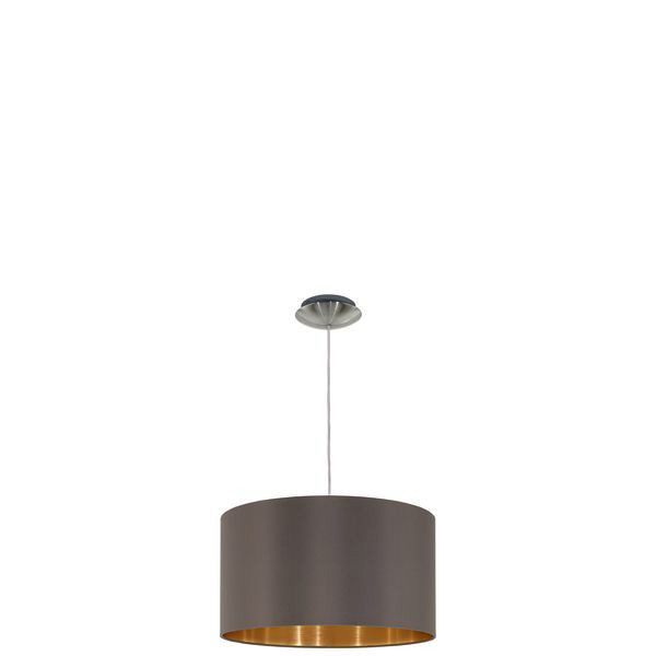 Die Pendelleuchte MASERLO ist mit einem runden Lampenschirm aus cappuccinofarbenem Textil und einer nickel-matten Metallaufhängung gefertigt. Kombiniert wurde der Schirm mit einer goldfarbenen Innenseite, die das moderne Design der Hängelampe gekonnt abrundet. Sie fügt sich mit ihrem Durchmesser von 38 cm nahtlos in minimalistische Einrichtungen ein und bietet eine wohnliche Beleuchtung für jeden Raum – egal ob im Wohnzimmer, Schlafzimmer oder im Esszimmer über dem Esstisch. Das Leuchtmittel ist nicht im Lieferumfang enthalten. Geeignet ist die Leuchte für jedes Leuchtmittel mit E27-Sockel.