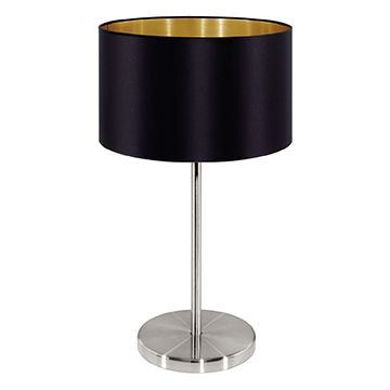 Die Tischleuchte MASERLO besteht aus einem nickel-matten Metallfuß und einem runden Lampenschirm aus schwarzem Textil. Kombiniert wurde der Schirm mit einer goldfarbenen Innenseite, die das moderne Design der Tischlampe gekonnt abrundet. Ein bequemes Ein- und Ausschalten ist über einen Schalter am Kabel möglich. Sie fügt sich nahtlos in minimalistische Einrichtungen ein und bietet eine wohnliche Beleuchtung für jeden Raum – egal ob im Schlafzimmer auf dem Nachttisch, im Wohnzimmer oder im Flur. Das Leuchtmittel ist nicht im Lieferumfang enthalten. Geeignet ist die Leuchte für jedes Leuchtmittel mit E27-Sockel.