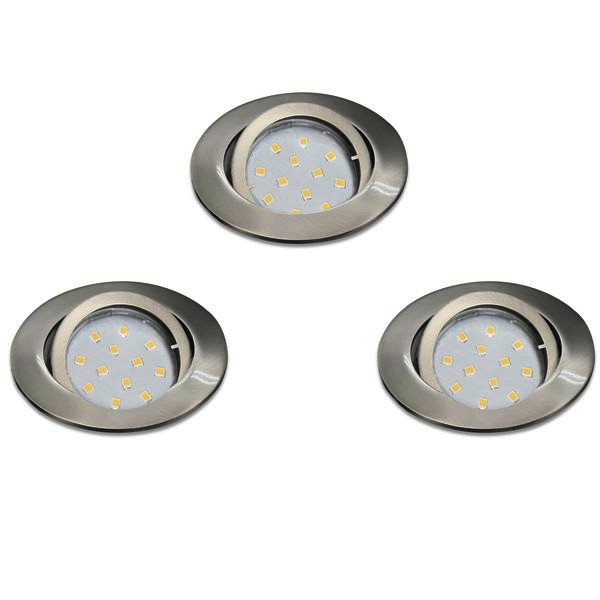 Das 3er Set der LED Einbauleuchte TEDO mit dem Durchmesser von 80 mm ist aus Aluguss in Nickel-Matt gefertigt. Die mitgelieferten LED GU10-Leuchtmittel spenden angenehmes warmweißes Licht. Die schwenkbaren Einbauspots eignen sich hervorragend zur gezielten Ausleuchtung eines Raumes. Die Leuchten haben eine Einbautiefe von 115 mm und ermöglichen durch das zeitlose Design den Einsatz in jedem Wohnraum – egal ob in der Küche, im Wohnzimmer, Schlafzimmer, Flur oder Esszimmer. Für den Einbau wird ein Ausschnitt von Ø 68 mm benötigt.