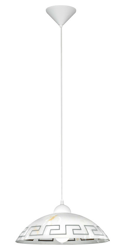 Die Pendelleuchte VETRO ist mit einem runden, satinierten Glas-Lampenschirm in einem weiß-braunen Farbenspiel gefertigt. Der geradlinige, dunkelgraue Dekor auf dem Schirm ist angelehnt an das klassische Mäander-Muster. Abgehängt wurde der Glasschirm von einem weißen Baldachin aus Kunststoff. Die Hängelampe fügt sich nahtlos in klassische Einrichtungen im Landhausstil ein und bietet eine passende Beleuchtung in der Küche oder im Esszimmer über dem Esstisch. Das Leuchtmittel ist nicht im Lieferumfang enthalten. Geeignet ist die Leuchte für jedes Leuchtmittel mit E27-Sockel.