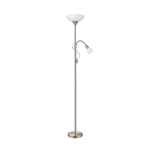 Die Stehleuchte UP 2 ist aus Metall in Nickel-Matt gefertigt. Der Leuchtenkopf aus weißem Glas strahlt das Licht an die Decke, sodass eine angenehme, indirekte Beleuchtung entsteht. Das Leuchtelement am Körper der Stehlampe mit einem Spot aus weißem Glas ist flexibel und lässt sich so ideal als Leselicht nutzen. Beide Lichtquellen lassen sich bequem und getrennt voneinander über die zwei Schalter am Kabel ein- und ausschalten. Der zeitlose Deckenfluter fügt sich in verschiedene Einrichtungen ein und bietet eine moderne Beleuchtung für jeden Raum – egal ob im Schlafzimmer oder Wohnzimmer. Die benötigten Leuchtmittel sind nicht im Lieferumfang enthalten. Geeignet ist die Standlampe für ein Leuchtmittel mit E27-Sockel sowie für ein Leuchtmittel mit E14-Sockel.