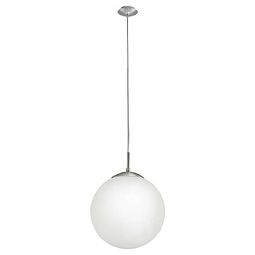 Die Pendelleuchte RONDO besteht aus einer weißen, opal-matten Glas-Kugel, die von einem runden, nickel-matten Metall-Baldachin abgehängt wurde. Die Hängelampe fügt sich mit ihrem puristischen Design nahtlos in verschiedene Einrichtungsstile ein und bietet eine gemütliche Beleuchtung im Wohnraum, ob im Wohnzimmer oder Esszimmer. Das Leuchtmittel ist nicht im Lieferumfang enthalten. Geeignet ist die Leuchte für jedes Leuchtmittel mit E27-Sockel.