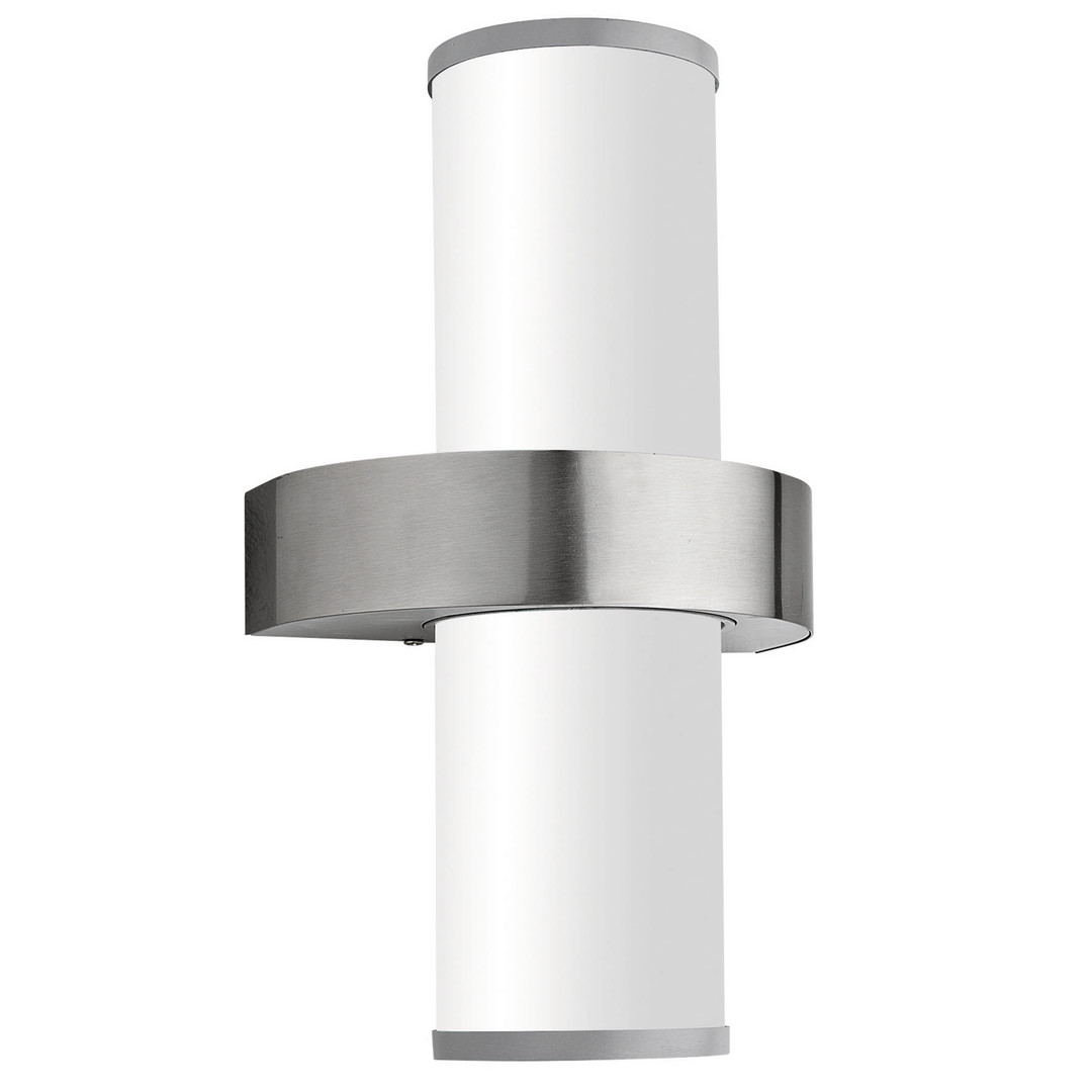 Die Außen-Wandleuchte BEVERLY besteht aus einer Edelstahl-Aufhängung, an der oben und unten zylinderförmige, weiß-satinierte Gläser angebracht wurden. Die Leuchte ist spritzwassergeschützt (IP44) und ermöglicht einen bedenkenlosen Einsatz im Außenbereich. Dank des zeitlosen Designs fügt sie sich in jeden modernen Outdoor-Bereich ein.