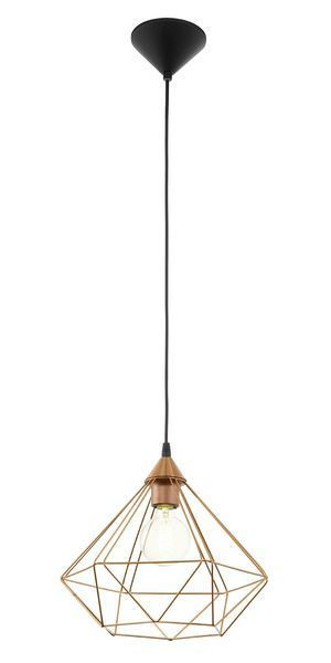 Die Pendelleuchte TARBES ist mit einem kupferfarbenen Draht-Schirm in filigraner Diamant-Form gefertigt, der von einem schwarzen, runden Baldachin abgehängt wurde. Durch den geometrischen Schirm entstehen im eingeschalteten Zustand faszinierende Licht- und Schattenspiele. Die moderne Hängelampe bietet eine stilvolle Beleuchtung für jeden Raum – egal ob im Wohnzimmer, Schlafzimmer oder Esszimmer. Das abgebildete Filament-Leuchtmittel ist nicht im Lieferumfang enthalten. Geeignet ist die Leuchte für jedes Leuchtmittel mit E27-Sockel.