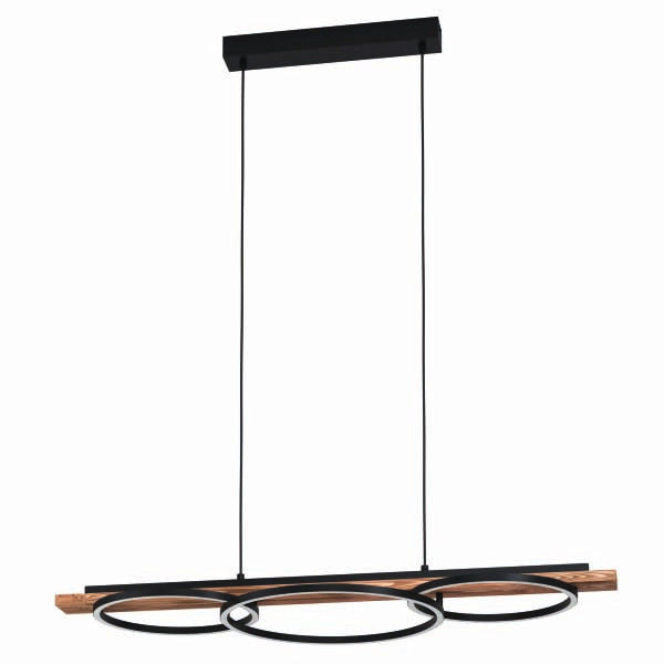 Die LED Pendelleuchte BOYAL ist aus geflammtem Pinienholz mit drei schwarzen, runden Metall-Profilen gefertigt. Kombiniert wird die Leuchte mit einer schwarzen Metall-Abhängung sowie zwei hochwertigen schwarzen Textilkabeln. Die LEDs in den aufgesetzten Profilen spenden angenehmes warmweißes Licht und sind dank der weißen Kunststoff-Abdeckungen nicht zu sehen. Durch den spannenden Material-Mix aus rustikalem Holz und kühlem Metall fügt sich die Hängelampe nahtlos in moderne Trends ein. Dank ihres außergewöhnlichen und zugleich minimalistischen Designs ist sie ein besonderer Eye-Catcher für jeden Raum – egal ob im Wohnzimmer oder Esszimmer beispielsweise über einem länglichen Esstisch.