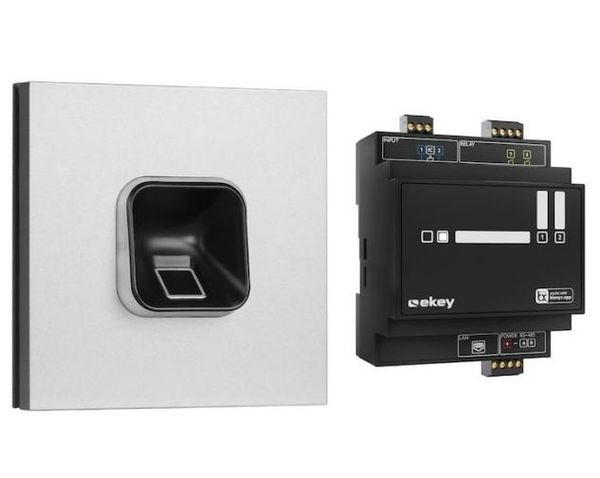 Das Fingerscanner-Set für Türstationen ist eine biometrische Zutrittslösung, die mittels intuitiver Touch-Bedienung schlüssellosen Zutritt zu Gebäuden gewährt, das Set beinhaltet das Türstationsmodul mit integriertem Fingerscanner und die Steuereinheit REG mit zwei Relais, die Verwaltung des Systems erfolgt über die ekey bionyx App