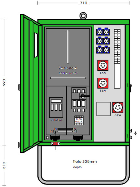 | Kurzbeschreibung | Anschlussverteilerschrank 44 kVA mit Zählerplatz, RCD Typ B, 3 CEE-Abgänge 16-32A und 6 Schutzkontakt-Steckdosen |