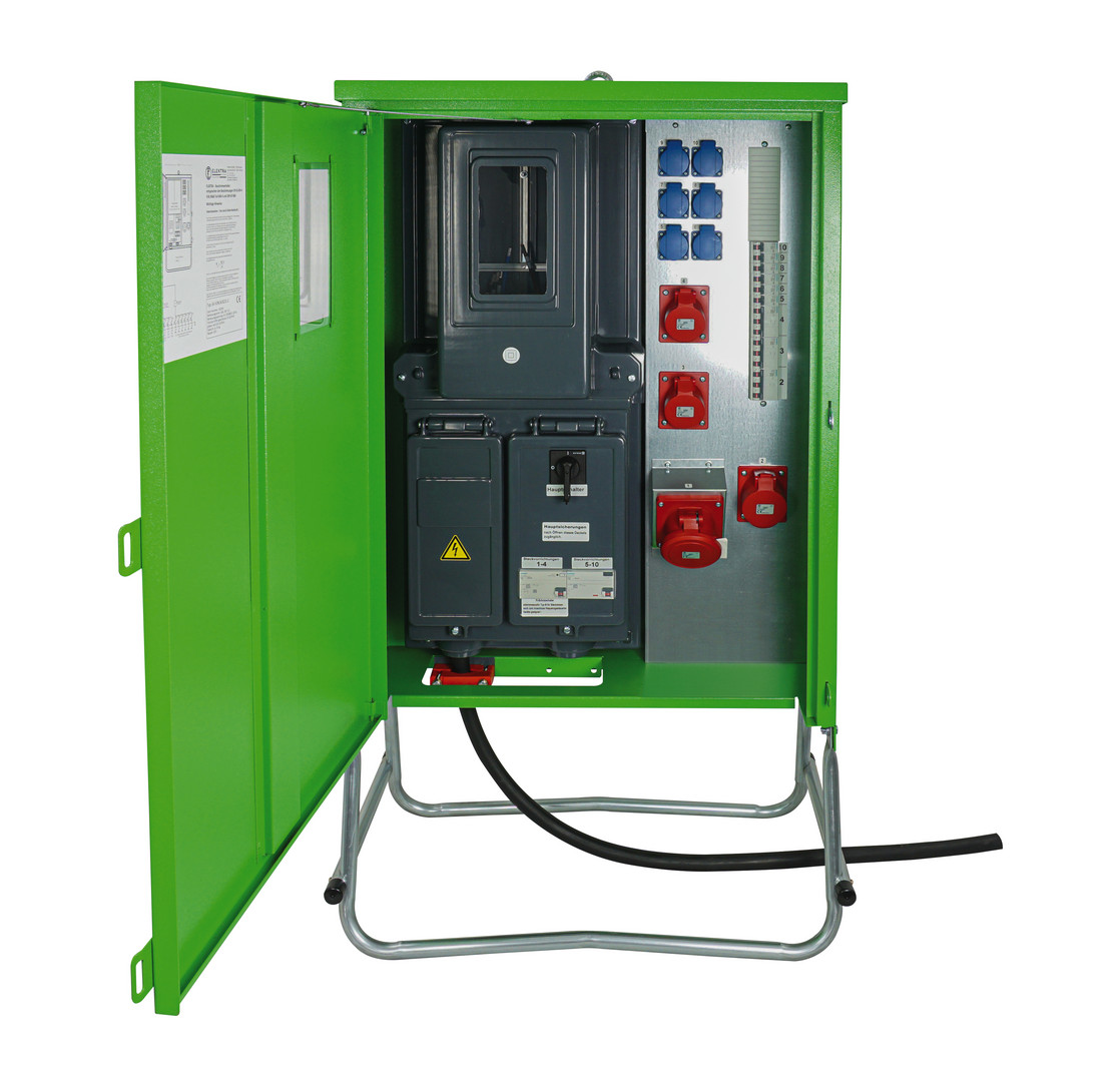 | Kurzbeschreibung | Anschlussverteilerschrank 44 kVA mit Zählerplatz, 2 RCD Typ B, 4 CEE-Abgänge 16-63A und 6 Schutzkontakt-Steckdosen |