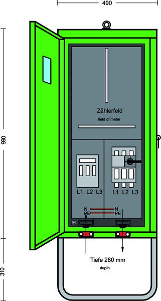 Gehäuse aus verzinktem Stahlblech, lakiert, RAL 6018, Lieferung komplett mit Untergestell und montiertem Sicherungszubehör, bestückt mit: - 1 Anschlusssicherung NH00-Trenner - 1 Zählerplatz - 1 Hauptsicherung als Lasttrennschalter mit Sicherung NH00