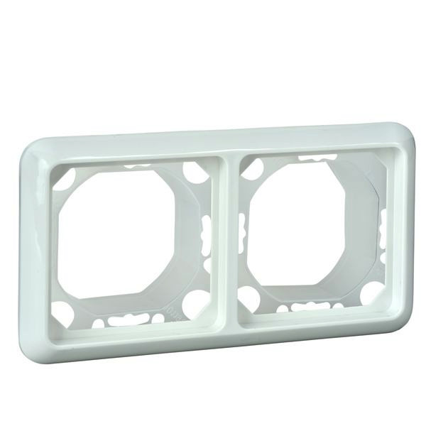 2-fach Rahmen ELSO FASHION IP 44. Farbe: reinweiß, geeignet für senkrechte und waagerechte Montage, Mit vormontiertem Dichtungsring und (pro Rahmensegment) beigelegtem Dichtungsflansch einschließlich Schrauben zur Schalter-Halteplattenbefestigung.