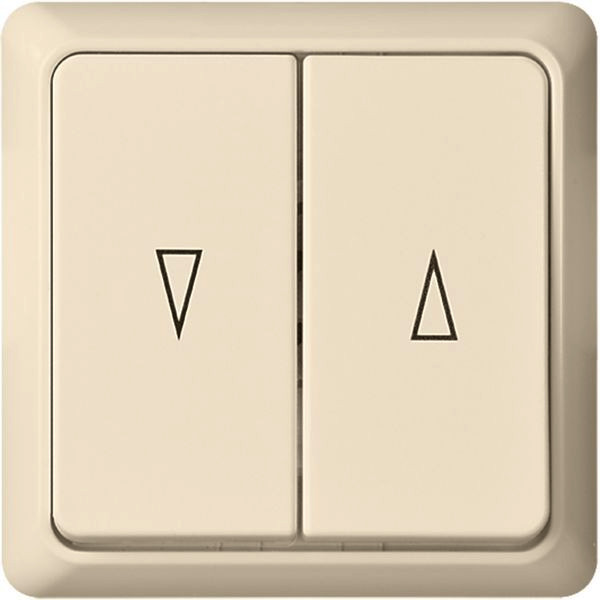 Jalousietaster. Farbe: perlweiß, mit mechanischer u. elektrischer Verriegelung gegen gleichzeitige Betätigung, nach Entfernung der Rückstellfeder auch als Jalousieschalter verwendbar, für Unterputzmontage. Schutzart IP 20, Taster 10 A, 250V AC, Rahmen und Wippen aus Thermoplast, auch einsetzbar in Geräteträger mit einer Einbautiefe von mindestens 32 mm. Steckklemmen: Klemmbereich für Informationsleitungen ab Leitungsdurchmesser 0,5mm, für Kupferleiter 1,5 mm und 2,5 mm.