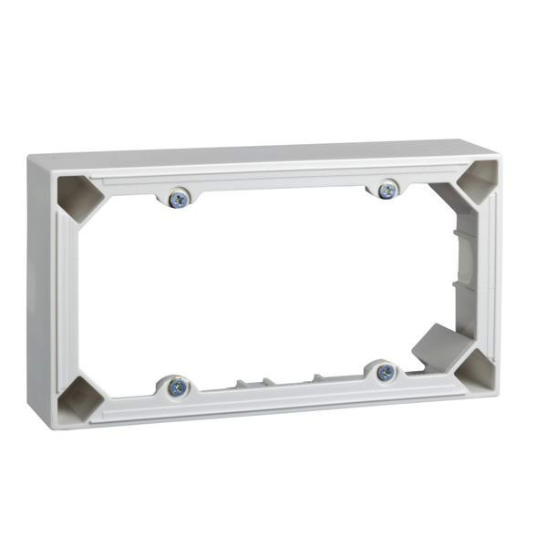 Aufputzgehäuse 2-fach, Farbe reinweiß zur Aufnahme der Unterputzgeräte bei Aufputzmontage, separater Rahmen erforderlich! mit Grundplatte Art. 274214 auch für brennbare Untergründe geeignet.