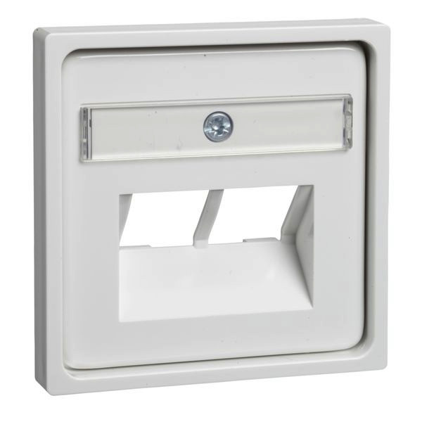 Zentralplatte mit Schriftfeld, geschirmt/ungeschirmt, Farbe: reinweiß Schriftfeld 8x45mm, für Einsätze: 2xRJ45: Art. 663030, 663284, 663288, 665128 und 665228, 2xRJ45: auch für Rutenbeck, BTR E-Dat-Design, Telegärtner u. AMP Netconnect5e Zentralplatten gerade (parallel zur Wand) für UAE.