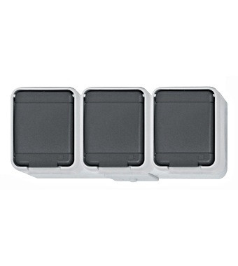 Steckdose 3-fach waagerecht, 16 A 250V AC. Farbe: licht-/basaltgrau, vorverdrahtet, für Aufputzmontage. Schutzart IP 44, mit zwei Leitungseinführungen, Steckklemmen: Klemmbereich für Kupferleiter 1,5 mm und 2,5 mm, Verbindungsklemmen nach VDE 0620.