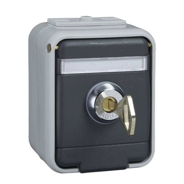 Steckdose 1-fach mit Schriftfeld abschließbar, 16 A 250V AC. Farbe: licht-/basaltgrau, mit Sicherheitsschloß und 2 Schlüsseln, verschiedene Schließungen, für Aufputzmontage. Schutzart IP 44, mit zwei Leitungseinführungen, Schraubklemmen: Klemmbereich für Kupferleiter 1,5 mm und 2,5 mm, für den sicheren Anschluss von Aluminiumleitern 2,5 mm ohne Vorbehandlung.