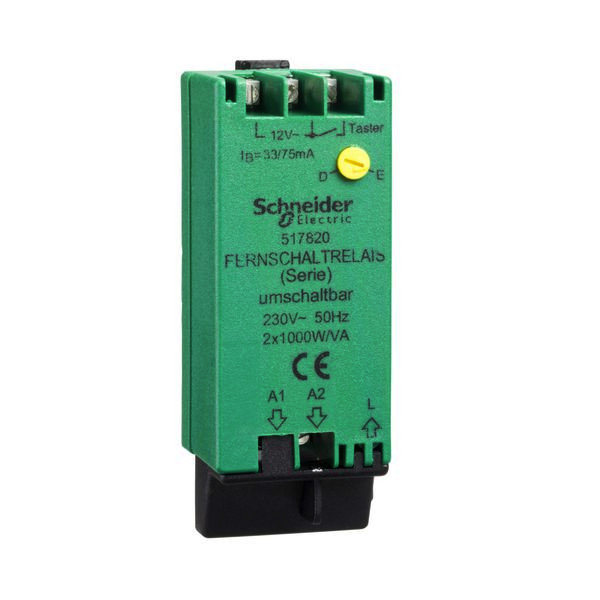 Umschaltbar bei Installation auf folgende Betriebsarten: E - Für Folgeschaltung, geeignet für beliebige beziehungsweise vorhandene unbeleuchtete Taster, Brennstellen werden nacheinander geschaltet. D - Für Serienschaltung, nur für Doppeltaster Art.-Nr. 506190, 506250 oder 506390, Brennstellen können unabhängig voneinander geschaltet werden. Nicht für den Anschluss beleuchteter Taster geeignet.Steuerspannung: 12 V ~, +30% -20%, IB = 33/75 mA, Schaltspannung: 230 V ~, für Glühlampen 230 V, 50 Hz, Halogenlampen 230 V, Leuchtstofflampen, konventionelle und elektronische Trafos, Abmessung: 2 PLE, geeignet für Energiesparlampen Fernschaltrelais 2x1000 W Umschaltbar bei Installation auf folgende Betriebsarten: E - Für Folgeschaltung, geeignet für beliebige beziehungsweise vorhandene unbeleuchtete Taster, Brennstellen werden nacheinander geschaltet. D - Für Serienschaltung, nur für Doppeltaster Artikelnummer 506190, 506250 oder 506390, Brennstellen können unabhängig voneinander geschaltet werden. Nicht für den Anschluss beleuchteter Taster geeignet. Steuerspannung: 12V AC, +30% -20%, IB 33/75 mA, Schaltspannung: 230V AC, 50 Hz, für Glühlampen 230 V, Halogenlampen 230 V, Leuchtstofflampen, konventionelle und elektronische Trafos, Abmessung: 2 PLE, geeignet für Energiesparlampen. Farbe: grün.