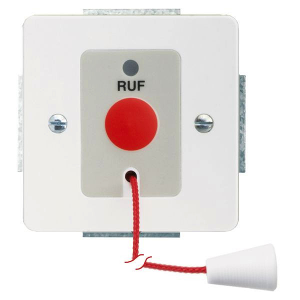 Taster wird im Aufputzrahmen oder in UP-Dose montiert. Ruftastereinsatz mit Zentralplatte für ELSO FASHION / SCALA / RIVA, mit membranbeschichtetem Knopf und Beruhigungslicht, geliefert mit 2 m langer Zugschnur, der Taster wird in einem Aufputzrahmen oder in einer UP-Dose montiert. Farbe: reinweiß.