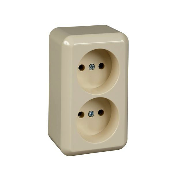 Steckdose ohne Schutzkontakt 2-fach, Farbe: perlweiß, 16 A 250V AC, Für Aufputzmontage, Schutzart IP 20, mit Grundplatte, für Montage auf brennbarem Untergrund geeignet. Schraubklemmen: Klemmbereich für Kupferleiter 1,5 mm und 2,5 mm, für den sicheren Anschluss von Aluminiumleitern 2,5 mm ohne Vorbehandlung.