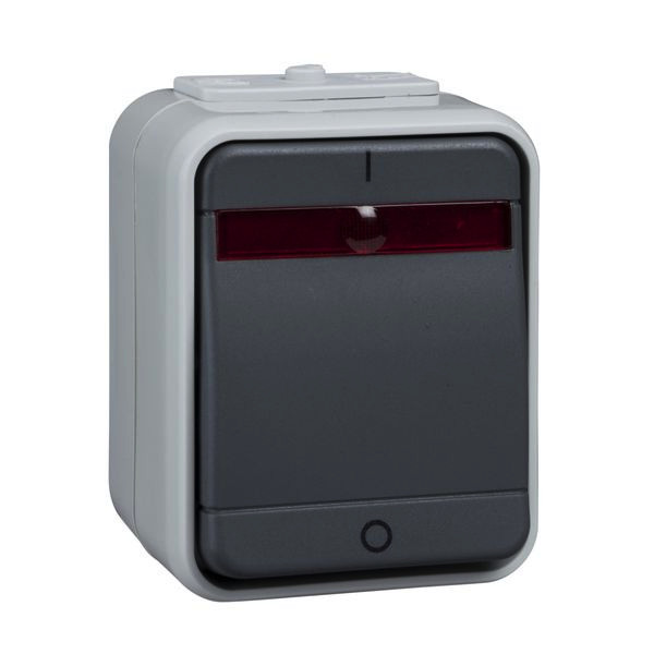 Kontroll-Ausschalter 2-polig, 10 A 250V AC. Farbe: licht-/basaltgrau, mit lichtintensiver Glimmlampe, für Aufputzmontage. Schutzart IP 44, mit zwei Leitungseinführungen, Steckklemmen: Klemmbereich für Informationsleitungen ab Leitungsdurchmesser 0,5mm, für Kupferleiter 1,5 mm und 2,5 mm.