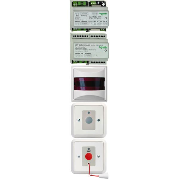 Ruf-Taster mit LED-Beruhigungslampe (rot), 2 m Perlonschnur inkl. Abdeckplatte, Rahmen im Design FASHION/SCALA, Abstelltaster mit LED-Erinnerungslampe inkl. Abdeckplatte, Rahmen, Zimmersignalleuchte (weiß) zur optischen und akustischen Signalisierung, Netzteil zur Bereitstellung der Systemspannung in verschidenen Ausführungen, erweiterbar um zusätzliche Gruppensignalleuchte (Art.-Nr. 740020) bzw. Dienstzimmereinheit ELG740140 zzgl. Abdeckungen und Rahmen. Behinderten-WC-Set mit USV-NT f. DIN-Schiene für ELSO FASHION. Set besteht aus: -einem Ruf-Taster mit LED-Beruhigungslampe (rot) und 2 m Perlonschnur inklusive Abdeckplatte und Rahmen Design ELSO FASHION. -einem Abstelltaster mit LED-Erinnerungslampe inklusive Abdeckplatte und Rahmen im Design ELSO FASHION. -einer Zimmersignalleuchte (weiß) zur optischen und akustischen Signalisierung. -einem Netzteil zur Bereitstellung der Systemspannung 24 VAC. 0,6 A. 3 PLE. Für eine weitere optische und akustische Signalisierung ist eine zusätzliche Gruppensignalleuchte. Artikelnummer 740020. anschließbar (gehört nicht zum Lieferumfang des Sets). Farbe: reinweiß.