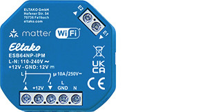 Beschattungsaktor mit IP, Matter über Wi-Fi, optional EnOcean, 1+1 Schließer 10 A/250 V AC, nicht potenzialfrei, für einen Beschattungselemente-Motor 230 V AC. Mit automatischer Endlagenerkennung. REST-API. Stand-by-Verlust nur 0,6 Watt. Für Einbaumontage. 46 x 45 mm, 20 mm tief. Die Anschlussklemmen sind Schraubklemmen für Leiterquerschnitte bis 2,5 mm². Vesorgungs- und Steuerspannung 12 V DC oder 110-240 V AC.