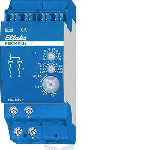 Stromstoß-Schaltrelais mit 2 Kanälen und Messung der Wirkleistung. 1+1 Schließer nicht potenzialfrei 16A/250V AC, 230V-LED-Lampen bis 600W, Glühlampen 2000W. Bidirektional. Stand-by-Verlust nur 0,9 Watt. Reiheneinbaugerät für Montage auf Tragschiene DIN-EN 60715 TH35. 2 Teilungseinheiten = 36mm breit, 58mm tief. Versorgungsspannung 230V. Anschluss an den ELTAKO-RS485-Bus. Querverdrahtung Bus und Stromversorgung mit Steckbrücke. Die Momentanleistung wird für jeden Kanal getrennt gemessen und dem Bus übergeben - z.B. zur Weitergabe an einen externen Rechner oder Controller - und auch über das FAM14 in das Funknetz gesendet. Der Maximalstrom als Summe über beide Kontakte beträgt 16A, es ist daher eine Absicherung an L mit maximal 16A erforderlich. Kontaktschaltung im Nulldurchgang zur Schonung der Kontakte und der Lampen. Beim Ausfall der Versorgungsspannung bleibt der Schaltzustand erhalten. Bei wiederkehrender Versorgungsspannung wird definiert ausgeschaltet. Die Kanäle können unabhängig voneinander als ES- und/oder ER-Kanal eingelernt werden. Szenen-Steuerung: Mit einem der vier Steuersignale eines als Szenentaster eingelernten Tasters mit Doppelwippe können mehrere Kanäle eines oder mehrerer FSR14M-2x zu je einer Szene ein- bzw. ausgeschaltet werden. Zentralbefehle können mit Funktastern und/oder mit einem Controller gesendet werden. Mit den Drehschaltern werden die Taster eingelernt und gegebenenfalls die 2 Kanäle getestet. Für den Normalbetrieb werden der mittlere und der untere Drehschalter anschließend auf AUTO gestellt. Bei dem oberen Drehschalter wird ggf. für alle Kanäle gleich die EW-Zeit (0-120 Sekunden) für Relais bzw. die RV-Zeit (0-120 Minuten) für Stromstoßschalter eingestellt. Werden Funk-Bewegungs-Helligkeitssensoren FBH (Master) und/oder FBH (Slave) eingelernt, wird mit dem oberen Drehschalter, für jeden Kanal getrennt, die Schaltschwelle festgelegt, bei welcher die Beleuchtung einschaltet bzw. ausschaltet. Einstellungen des oberen Drehschalters gemäß Bedienungsanleitung. Werden Funk-Helligkeitssensoren eingelernt, wird mit dem oberen Drehschalter, für jeden Kanal getrennt, die Schaltschwelle festgelegt, bei welcher in Abhängigkeit von der Helligkeit die Beleuchtung einschaltet bzw. ausschaltet (von ca. 0 lux in der Position 0 bis ca. 50 lux in der Position 120). Eine Hysterese von ca. 300 lux zwischen dem Ein-und Ausschalten ist fest eingestellt. Eine zusätzlich eingestellte RV-Zeit wird nicht beachtet. Je Kanal kann nur ein FBH (Master) oder FAH eingelernt werden. Ein FBH (Master) oder FAH kann jedoch in mehrere Kanäle eingelernt werden. Werden Funk-Fenster-Türkontakte FTK oder Fenstergriffsensor FFG7B eingelernt, lassen sich mit dem mittleren Drehschalter in den Positionen AUTO 1 bis AUTO 4 unterschiedliche Funktionen einstellen und maximal 116 FTK verknüpfen: AUTO 1 = Fenster zu, dann Ausgang aktiv. AUTO 2 = Fenster offen, dann Ausgang aktiv. In den Stellungen AUTO 3 und AUTO 4 sind die auf einem Kanal eingelernten FTK automatisch verknüpft. Bei AUTO 3 müssen alle FTK geschlossen sein, damit der Arbeitskontakt schließt (z.B. für Klimasteuerung). Bei AUTO 4 genügt ein geöffneter FTK, um den Arbeitskontakt zu schließen (z.B. für Alarmmeldung oder Zuschalten der Stromversorgung eines Dunstabzuges). Ein oder mehrere FTK können in mehrere Kanäle eingelernt werden, damit verschiedene Funktionen gleichzeitig je FTK möglich sind. Nach einem Stromausfall wird die Verknüpfung durch ein neues Signal der FTK bzw. bei der nächsten Statusmeldung nach 15 Minuten wieder hergestellt. Eine zusätzlich eingestellte RV-Zeit wird nicht beachtet. Funktion mit Funk-Rauchwarnmeldern FRW oder Wassersensoren gemäß Bedienungsanleitung. Die LED unter dem oberen Drehschalter begleitet den Einlernvorgang gemäß Bedienungsanleitung und zeigt im Betrieb Steuerbefehle durch kurzes Aufblinken an.