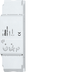Stromstoß-Schaltrelais 1 Schließer nicht potenzialfrei 16A/250V AC, 230V-LED-Lampen bis 400W, Glühlampen 2000W. Mit Lichtszenensteuerung über PC oder mit Funktastern. Verschlüsselter Funk, bidirektionaler Funk und Repeater-Funktion zuschaltbar. Stand-by-Verlust nur 0,8 Watt. Montage in die 230V-Netzanschlussleitung, zum Beispiel in Zwischendecken und Leuchten. 166mm lang, 46mm breit und 31mm hoch. Mit Kabel-Zugentlastung. Beim Ausfall der Versorgungsspannung bleibt der Schaltzustand erhalten. Bei wiederkehrender Versorgungsspannung wird definiert ausgeschaltet. Szenen-Steuerung: Mit einem der vier Steuersignale eines als Szenentaster eingelernten Tasters mit Doppelwippe können mehrere FSR71NP zu je einer Szene ein- bzw. ausgeschaltet werden. Zentralbefehle über die App werden mit einem Professional Smart Home-Controller gesendet. Hierzu über die jeweilige App einen oder mehrere FSR71NP einlernen. Mit den Drehschaltern werden die Taster eingelernt und gegebenenfalls das Gerät getestet. Für den Normalbetrieb werden der mittlere und der untere Drehschalter anschließend auf AUTO gestellt. Bei dem oberen Drehschalter wird ggf. die EW-Zeit (0-120 Sekunden) für Relais bzw. die RV-Zeit (0-120 Minuten) für Stromstoßschalter eingestellt. Werden Funk-Bewegungs-Helligkeitssensoren FBH (Master) und/oder FBH (Slave) eingelernt, wird mit dem oberen Drehschalter die Schaltschwelle festgelegt, bei welcher die Beleuchtung einschaltet bzw. ausschaltet. Einstellungen des oberen Drehschalters gemäß Bedienungsanleitung. Werden Funk-Helligkeitssensoren eingelernt, wird mit dem oberen Drehschalter die Schaltschwelle festgelegt, bei welcher in Abhängigkeit von der Helligkeit die Beleuchtung einschaltet bzw. ausschaltet (von ca. 0lux in der Position 0 bis ca. 50lux in der Position 120). Eine Hysterese von ca. 300lux zwischen dem Ein- und Ausschalten ist fest eingestellt. Eine zusätzlich eingestellte RV-Zeit wird nicht beachtet. Es kann nur ein FBH (Master) oder FAH eingelernt werden. Werden Funk-Fenster-Türkontakte FTK oder Fenstergriffsensor FFG7B eingelernt, lassen sich mit dem mittleren Drehschalter in den Positionen AUTO 1 bis AUTO 4 unterschiedliche Funktionen einstellen und maximal 116 FTK verknüpfen: AUTO 1 = Fenster zu, dann Ausgang aktiv. AUTO 2 = Fenster offen, dann Ausgang aktiv. In den Stellungen AUTO 3 und AUTO 4 sind die eingelernten FTK automatisch verknüpft. Bei AUTO 3 müssen alle FTK geschlossen sein, damit der Arbeitskontakt schließt (z.B. für Klimasteuerung). Bei AUTO 4 genügt ein geöffneter FTK, um den Arbeitskontakt zu schließen (z.B. für Alarmmeldung oder Zuschalten der Stromversorgung eines Dunstabzuges). Nach einem Stromausfall wird die Verknüpfung durch ein neues Signal der FTK bzw. bei der nächsten Statusmeldung nach 15 Minuten wieder hergestellt. Eine zusätzlich eingestellte RV-Zeit wird nicht beachtet. Werden Wassersensoren eingelernt, lassen sich mit dem mittleren Drehschalter in den Positionen AUTO 1 bis AUTO 4 unterschiedliche Funktionen einstellen. AUTO 1 = kein Wasser, dann Arbeitskontakt geschlossen. AUTO 2 = Wasser, dann Arbeitskontakt geschlossen. In den Stellungen AUTO 3 und AUTO 4 sind die auf einem Kanal eingelernten Wassersensoren automatisch verknüpft. Bei AUTO 3 müssen alle Wassersensoren kein Wasser gemeldet haben, damit der Arbeitskontakt schließt. Der Arbeitskontakt öffnet, wenn ein Wassersensor Wasser meldet. Bei AUTO 4 schließt der Arbeitskontakt, wenn ein Wassersensor Wasser meldet, erst wenn alle Wassersensoren kein Wasser gemeldet haben öffnet der Arbeitskontakt. Eine zusätzlich eingestellte RV-Zeit wird nicht beachtet. Die LED unter dem oberen Drehschalter begleitet den Einlernvorgang gemäß Bedienungsanleitung und zeigt im Betrieb Steuerbefehle durch kurzes Aufblinken an.
